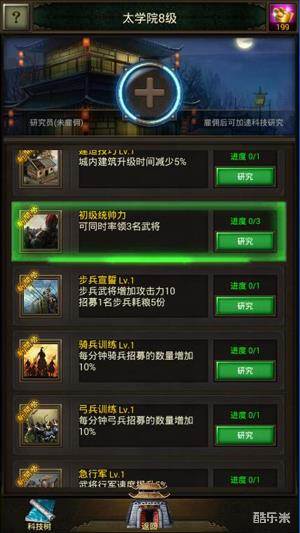 除此之外,你还有更重要的工作——太学院科技建造。太学院的建造建议主要以统帅力、点兵术、士兵宣誓为优先原则。因为不论是刷副本,还是打流寇,甚至报仇去抢敌人的资源,战力往往都是最重要的,而其它建筑的研究晚些时日也无大碍。