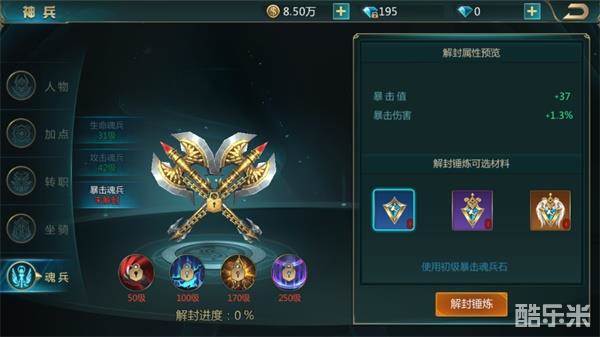 生命魂兵和攻击魂兵分别提升生命和攻击。暴击魂兵除了可以提升暴击值和暴击伤害之外,还附带4个魂兵技能,魂兵技能随着暴击神兵的等级提升而逐渐解锁。