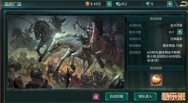 血色广场中会不断的刷新小怪,玩家击败小怪将获得大量经验,副本中玩家可以通过加倍药水鼓舞和金币、钻石鼓舞来增加经验,组队进入获得经验更多。