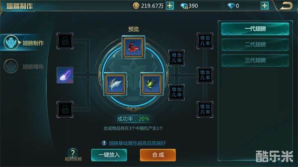翅膀合成成功的初始几率较低,玩家可以通过添加紫色及以上品质的装备来增加几率。合成时,翅膀各有三分之一的概率合成为某一职业的翅膀,不对应的职业是不能装备上该翅膀的。翅膀有三代,一代翅膀只需要合成材料即可合成,二代、三代翅膀除了需求合成材料以外,还需要上一代翅膀一起合成。二代与三代翅膀的合成材料分别要击杀200级的BOSS和300级的BOSS。