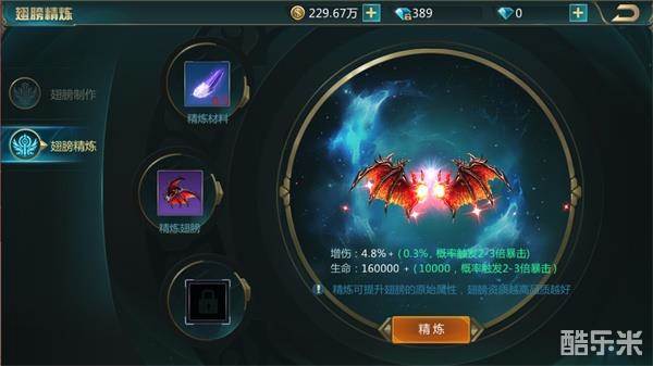 装备上翅膀以后可以对翅膀进行精炼,增加翅膀的属性上限,精炼需要的材料与合成翅膀的材料一致。