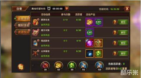 在日常界面中,冒险者们可以看到最下方的活跃条,一共分为150点。完成不同的日常活动或限时活动都能够获得一定数量的活跃度,如悬赏任务能够获得20活跃度,魔王试炼能够获得30活跃度,挑战副本可以获得15点活跃度等。