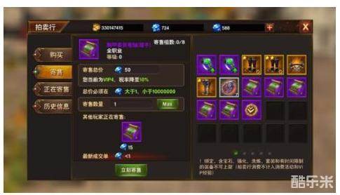 而你也可以使用寄售功能来出售一些用不到的素材,赚取钻石。选择了要寄售的商品以后,可以设置总价和数量,冒险者可以根据其他玩家正在寄售的同款商品的价格来制定合适的售卖价格。不过要注意的是,寄售商品需要收取一定的税费!另外,绑定、含宝石、强化、洗脸、套装和有时间限制的装备也不可上架!