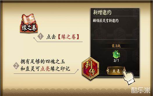 至于武士的缘之卷,就好似它的名字一样,这是你的武士跟你之间的羁绊,只有在玩家点亮缘之卷以后才可以为武士解锁新的剧情,包括:茶歇、邀约、列传等,提高武士属性点、提高精力上限、解锁生活技能!(点亮缘之卷印记需要消耗四魂和直灵)