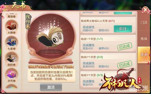 新修仙新养成,在4399《不朽凡人》的功法系统中,天书奥义助你全面突破门派功法的瓶颈,觉醒灭世之力历练成神!这里记载着阴阳卷、逍遥卷等仙法奥义,玩家必须深入各种副本秘境,擒朱雀屠青龙,完成每卷天书的任务才能激活强大战斗特技!