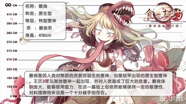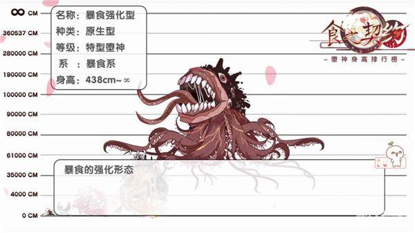 它的体重和身高可以随着吞噬的而不断的增大,虽然其初始的体型在438cm,但是若放任不管...它连甚至蜃楼都可以超过!
