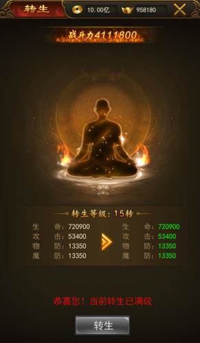转生分为15个等级,等级越高可获得更多的各项属性加成,极大的提升角色的战斗力。每个转生等级均有相对应的转生装备,不仅拥有比普通装备更为华丽的外形,更有着十分强大的属性。