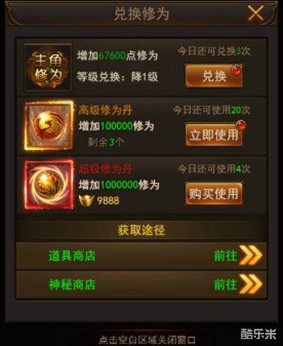 转生等级提升需要消耗转生修为,可以通过活动、礼包、商城等得到的修为丹来获取修为,也可通过降级兑换大量修为。经过转生的角色可以进入更为危险的转生地图,与更强大的BOSS战斗,获得更为极品的装备与丰厚的稀有材料。