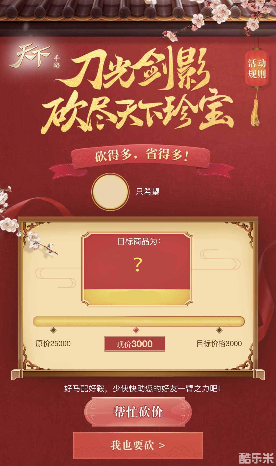 又是一年双十一,疯狂剁手别拦我!什么什么,今年规则太难看不懂?不如来试试《天下》手游“大荒砍价帮”h5,规则简单不套路,11月8日再次上线!只需在活动期间选择道具发起砍价,转发链接给大荒的亲朋好友们帮你砍一刀即可,助力好友越多越容易砍到最低价。砍价完成后一定要及时购买,错过购买期限就亏大发了。各位少侠每周可选择一个道具进行砍价,不要太贪心噢。还等什么,呼朋唤友一起来砍价啦!
