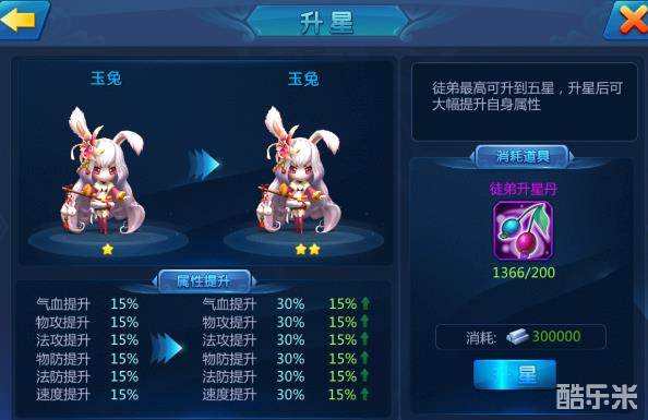 徒弟可通过使用【徒弟升星丹】来提升星级,目前最高为5星。