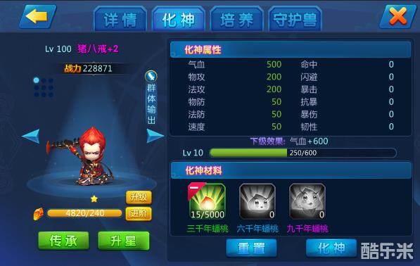 玩家可消耗【三千年蟠桃】、【六千年蟠桃】、【九千年蟠桃】来进行化神,从而提升大量属性。