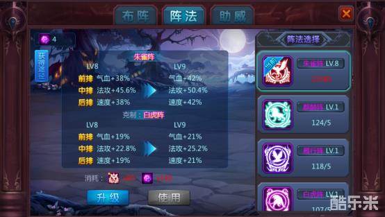 每个阵法最高20级,通过消耗自身残卷和升级石来升级。