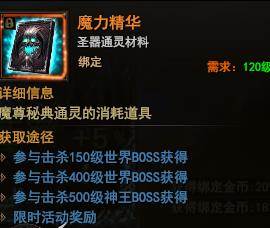 1、击杀150、400、500级的世界boss可以获取魔力精华。