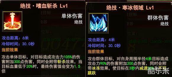 绝技主动技能目前有两个分别是:嗜血斩杀 寒冰领域。