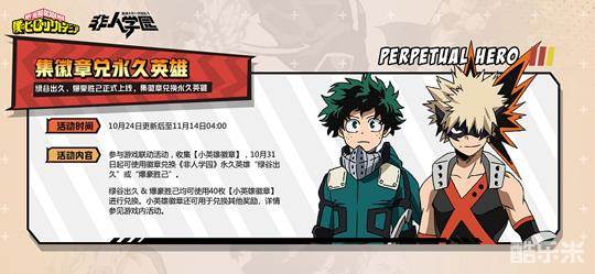 参与每日登录、好友集结、每日对战3个子活动,都能获得“小英雄徽章”。10月31日起,即可使用40枚小英雄徽章兑换《非人学园》永久英雄“绿谷出久”或“爆豪胜己”,徽章还可用于兑换其他奖励喔。想永久拥有咔酱和绿久,可不要错过!