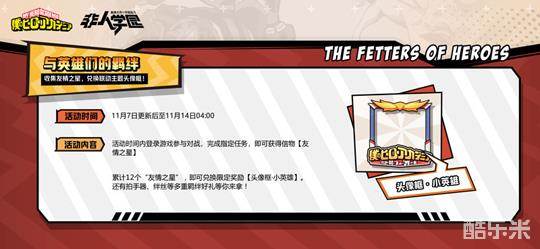 永久拥有了绿久和咔酱后,是不是想和他们关系更亲密呢?活动期间登录游戏参与对战,完成指定任务,即可获得信物“友情之星”。累计12个“友情之星”,即可兑换限定奖励头像框“小英雄”,还有拍手器、绊丝等多重羁绊好礼等你来拿!