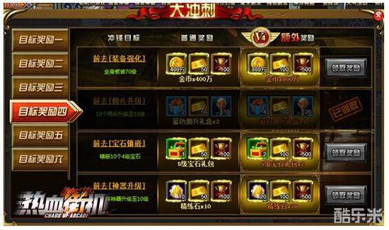 首先,可以看到大冲刺里有装备、佣兵、宝石、坐骑。那么简单,我们根据大冲刺的目标,一个一个来,先完成目标并领取奖励再说。