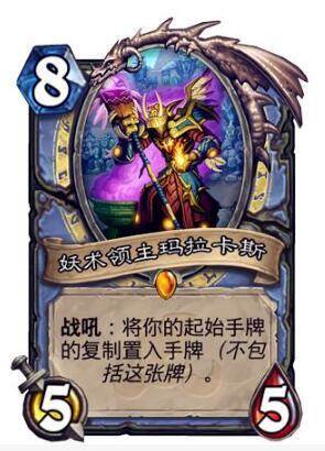 法师的传说随从“妖术领主玛拉卡斯”8费5攻5血,战吼:将你的起始手牌的复制置入手牌。小编是不太看好这张传说随从的,以其8费的高额费用来讲,55的身材并不优秀,起始手牌也过于不稳定,除了后手稳定硬币以外,换到什么谁也不好说,刻意去留Combo组件也有可能导致节奏过差,前期崩盘。