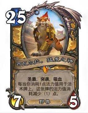 骑士的传说随从“西瓦尔拉,猛虎之神”25费7攻5血,圣盾,突袭,吸血效果,野兽属性。每当你消耗1点法力值用于法术牌上,这张牌的法力值消耗减少(1)点。有点类似于奥术巨人,但减费效果更强,整体来说偏慢速。就圣骑士的法术来讲更适合作为Buff骑组件,不太适合当前环境。元气骑的新希望,可惜王已经退环境了。