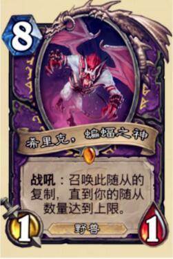 术士的传说随从“希里克,蝙蝠之神”8费1攻1血,野兽属性,战吼:召唤此随从的复制,直到你的随从数量达到上限。此传说卡牌为讨论度较高的一张牌,作为术士新传说被异灵术老师强心吹了一波“爆炸特效,场面拉满,还能配合咆哮打伤害!”,然后吹不下去,溜了。瓦莉拉也提到了这张卡和污手党机制的配合。