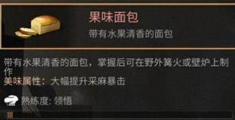 描述:带有水果清香的面包,掌握后可在野外篝火或壁炉上制作。