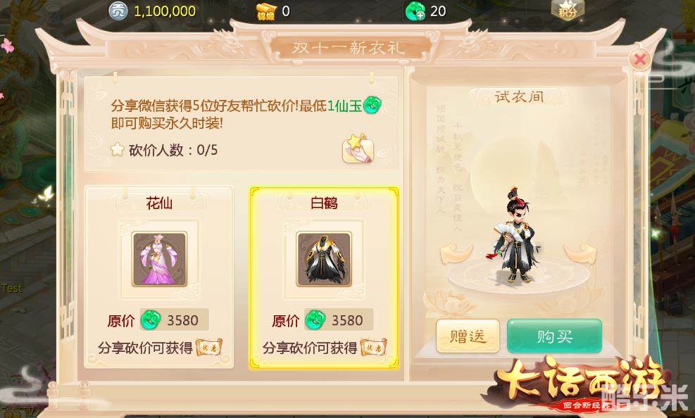 在11月11日10点至11月12日5点期间,玩家可从《大话西游》手游游戏内分享时装砍价活动到微信朋友圈,邀请好友帮忙砍价。玩家成功召集五名好友帮忙砍价,就有100%的机会获得惊喜折扣,更有机会得到1仙玉购买时装的惊喜优惠!各位少侠们,即刻召集好友砍价,畅享双十一福利,机会不容错过,更多惊喜,敬请期待!