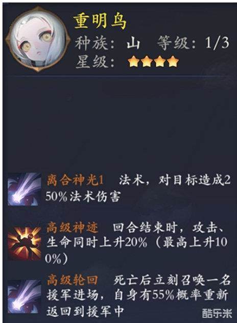 离合神光1:法术,250%伤害,非常不错的单体输出技能,虽然和一些暴力输出不能比,但重明鸟具有山系常见的成长技能,所以越打越厉害。