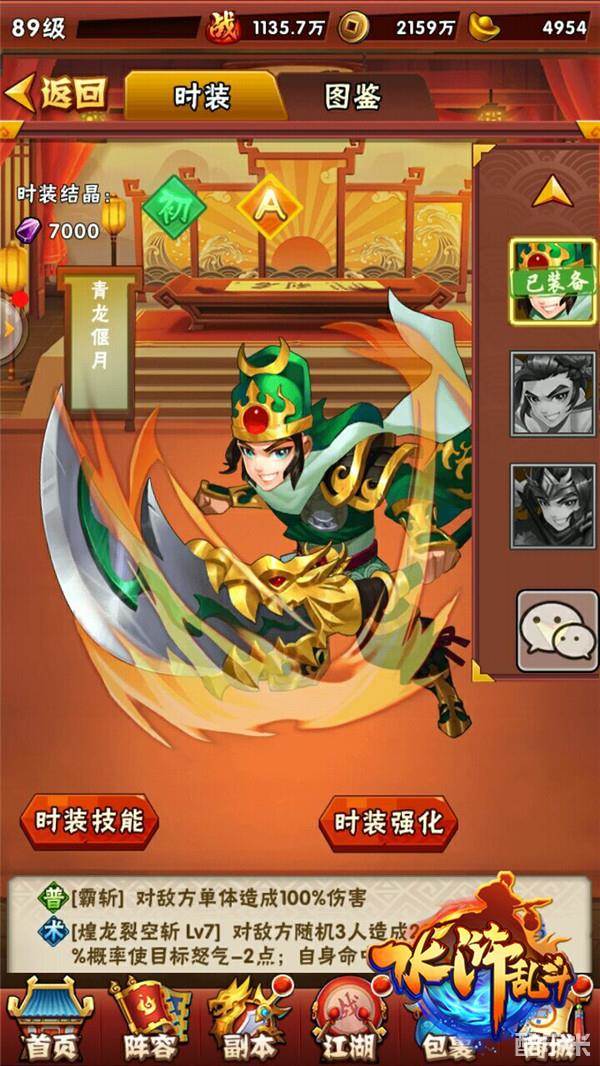技能:【青龙吟】对敌方随机3人造成222%伤害,目标25%概率额外承受30%伤害,持续2回合;自身暴击+15%,暴击伤害+15%,持续2回合。
