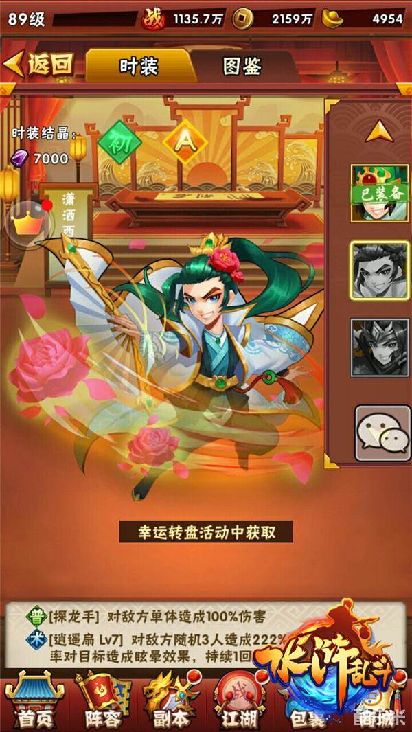 技能:【逍遥扇】对敌方随机3人造成222%伤害,25%概率对目标造成眩晕效果,持续1回合;自身暴击+15%,闪避+15%,持续2回合。