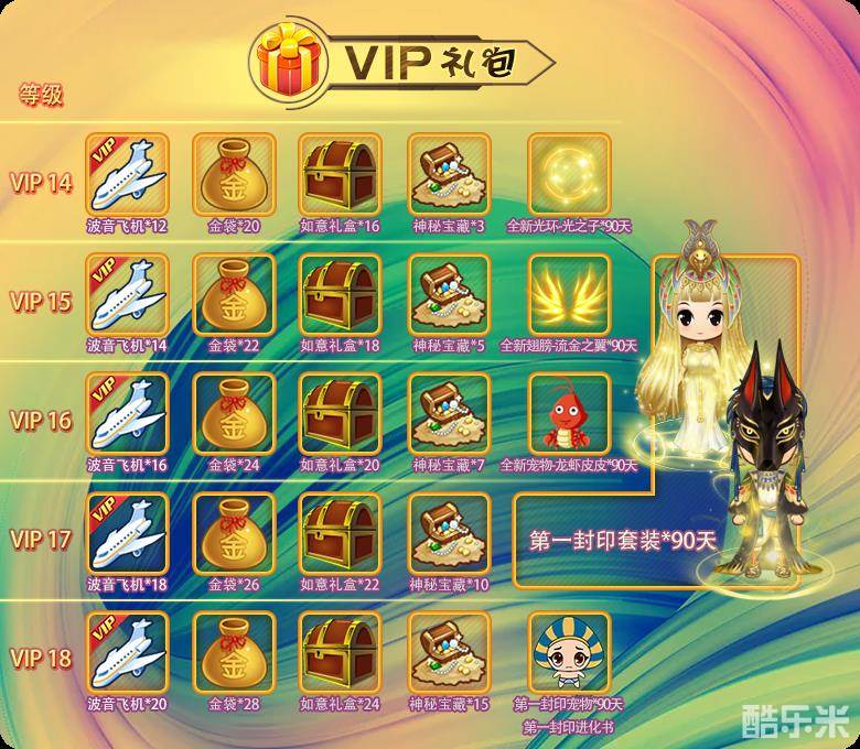 达到VIP17等级的玩家将按照自己的性别领取“第一封印”套装之一。