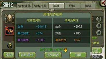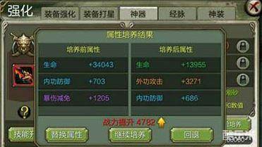 一个神器拥有三个装备属性,加攻加血加防等等,也分为橙紫蓝绿白五个颜色级别!每培养一次三个属性都会随机发生变化,但是出了极品或你觉得满意的属性你可以在商城100元宝购买金刚沙锁定,一个金刚沙只能锁定一次,培养后消失!想要锁定两个满意的属性再洗另一个属性,一次就需要两个金刚沙!所以最好等培养出了高攻击或者橙色属性再购买金刚沙锁定!培养一次需要消耗30万当前人物经验或5000金币!