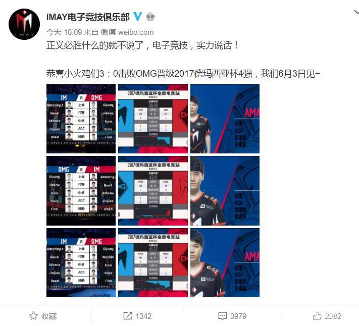 赛后,IM官博发表微博:“正义必胜什么的就不说了,电子竞技,实力说话!”