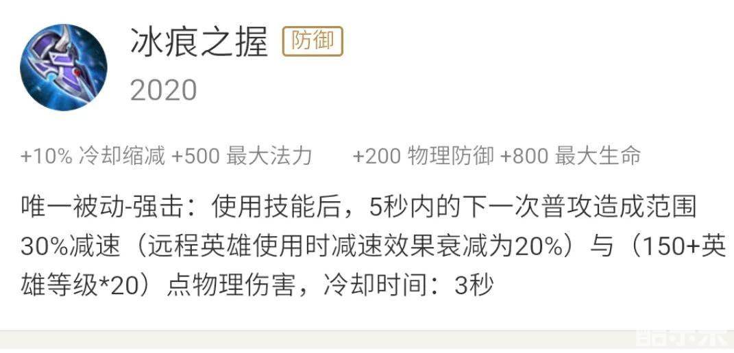 在王者荣耀里,很多人在装备上并不是很了解,尤其是一些不常见的装备,更是所知甚少。很多的老玩家对于冰痕之握这件装备是比较了解的,但是对于许多新手玩家来说,就不知道这件装备的用途。首先它的作用就是加10%的冷却时间、加500最大法力、加200防御力、加800最大生命值。