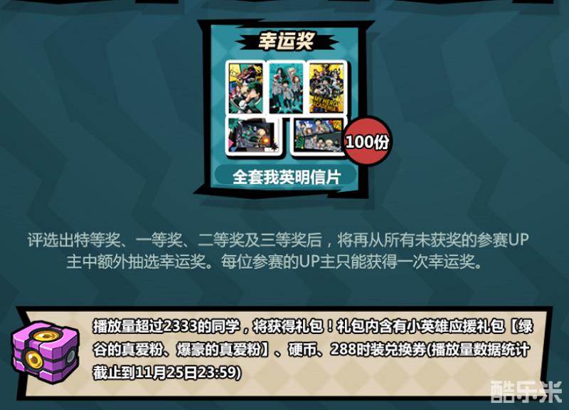 评选出应援奖项后,还将从所有未获奖的参赛UP主中抽取100名幸运奖得主,获得全套我英明信片。此外,凡是活动中视频播放量超过2333的同学,都能获得小英雄应援礼包,得到包括硬币、时装兑换劵在内的丰厚奖励!
