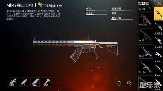 刺激战场在11月新版本中将更新新的武器和配件,分别是MK47突击步枪和激光瞄准器,MK47突击步枪是一款中程距离的步枪,适合近距离作战,7.62mm子弹加20发的弹夹,可以配备4个配件,支持单发和两连发,这把枪还得经过实战的考验,本篇酷乐米小编为大家带来关于新武器MK47突击步枪的评测,另外再说说MK47突击步枪搭配上激光瞄准器的效果,快来看看吧。