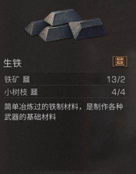 生铁是制作武器的基础材料。需要铁矿*2、小树枝*1,在装备制作台制作。