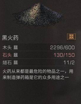 黑火药是制作弹药箱的材料,也可以用来补充军火箱的弹药。需要木头*600、石头*150、燧石*2,在装备制作台制作。