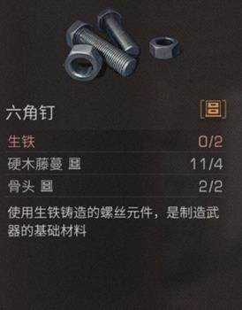 六角钉是制作武器的材料。需要生铁*2、硬木藤蔓*4、骨头*2,在装备制作台制作。