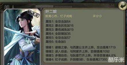 而且,叶二娘激活的减伤也拿不出手,别的美人的减伤不比她低。再次,叶二娘的各种属性加成都显得不伦不类,就是每次进阶加的属性,比如攻击,每次进阶才38点,而那些王语嫣,西夏公主之类的,每次进阶攻击都是加60多的。其他的那些属性就不多说了,各人可以自己去比较。总之,对于不缺美人的玩家而言,叶二娘真的是可有可无的,而且反而需要浪费资源去培养。