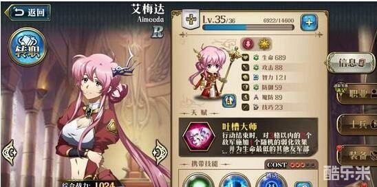 艾梅达是三小强中一位梦幻模拟战手游原创的进攻辅助型的奶妈,奶量只能算一般般。粉毛的核心技能基本都在圣者这一条线上,我们只要转职这条线就可以了。技能搭配为治疗术+圣言+终极吐槽,终极吐槽能够驱散能够叠加buff,算是一个不错的技能,加上天赋的debuff效果,在游戏前期还是非常不错的。在打各种龙时,也可以带上粉毛,毕竟龙免疫很多debuff,但是粉毛的降低防御的buff还是有用的,非常的实在。