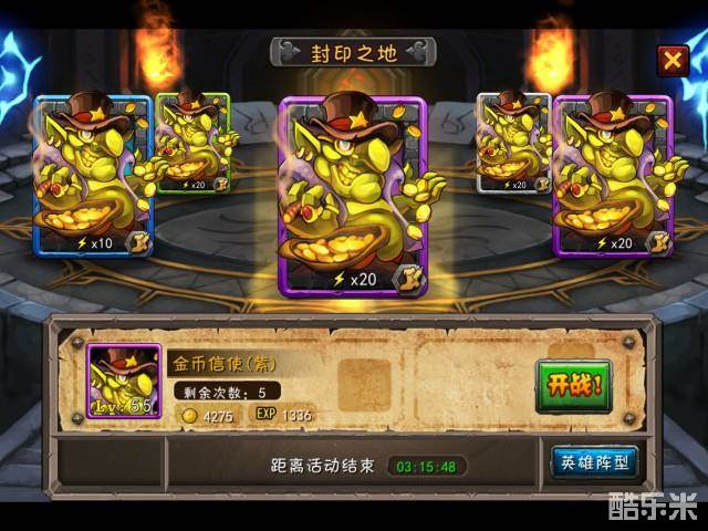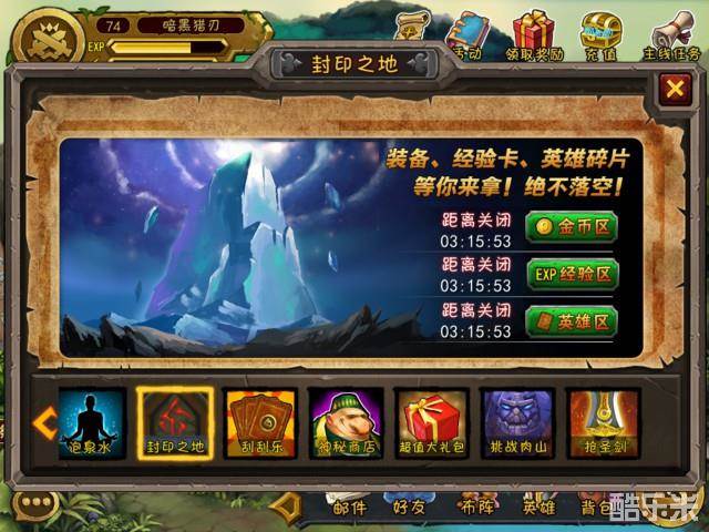 封印之地中设置了3个区域,分为:金币区、经验区、英雄区。 金币区:击杀不同的难度会掉落相应的金币信使卡牌或碎片,然后在英雄选项中进行出售就可获得海量金币。