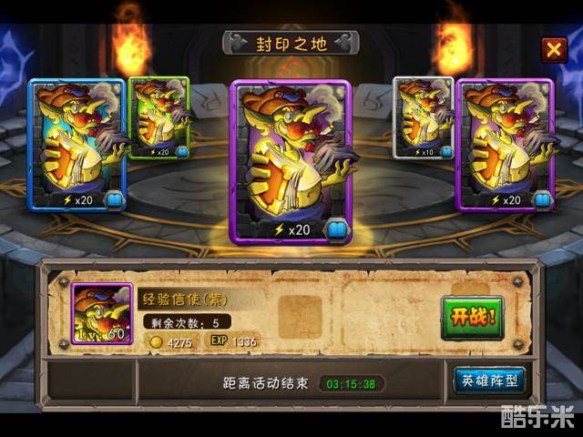经验区:击杀不同的难度会掉落相应的经验信使卡牌或碎片,此类卡牌可以用于英雄升级使用,会获得海量的经验。