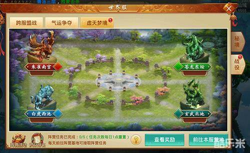 “虚天梦境”阵营战可谓是如今《百战天下》中参与人数最多也是最为有趣的玩法之一,以“世界服”为基数,每隔一段时间,“虚天梦境”会自动对玩家们所在的服务区进行分配,所有分配在一起的服,将会两两组合,生成朱雀南宫、苍龙东坛、白虎西池、玄武北地四大阵营,玩家们需要为自己的阵营战斗,赢得尽量多的积分!