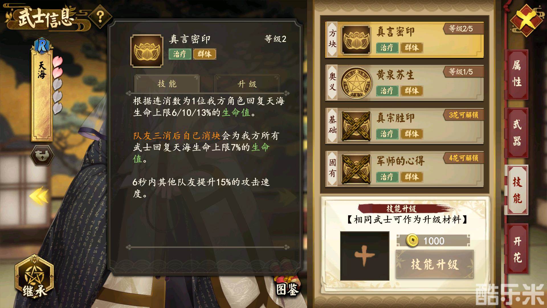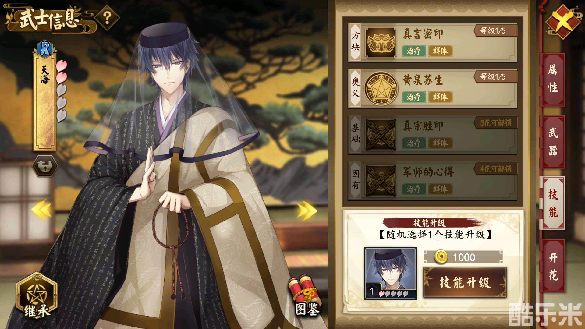 武士的技能会随着武士的开花而慢慢解锁,但是开花只能解锁技能,不会提高技能的等级,提高武士技能等级会让技能的百分比数值变高,让技能威力更大,那么要提升技能,就需要用到同级别的相同武士以及一定的金钱作为技能的升级材料。