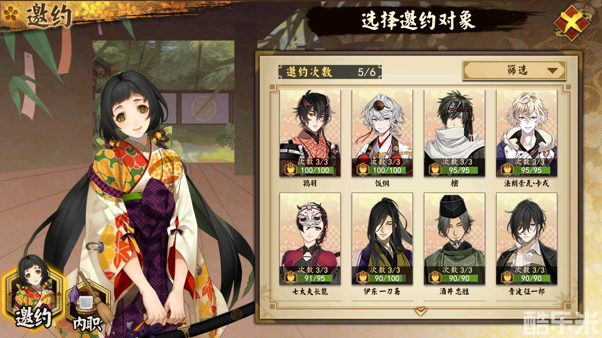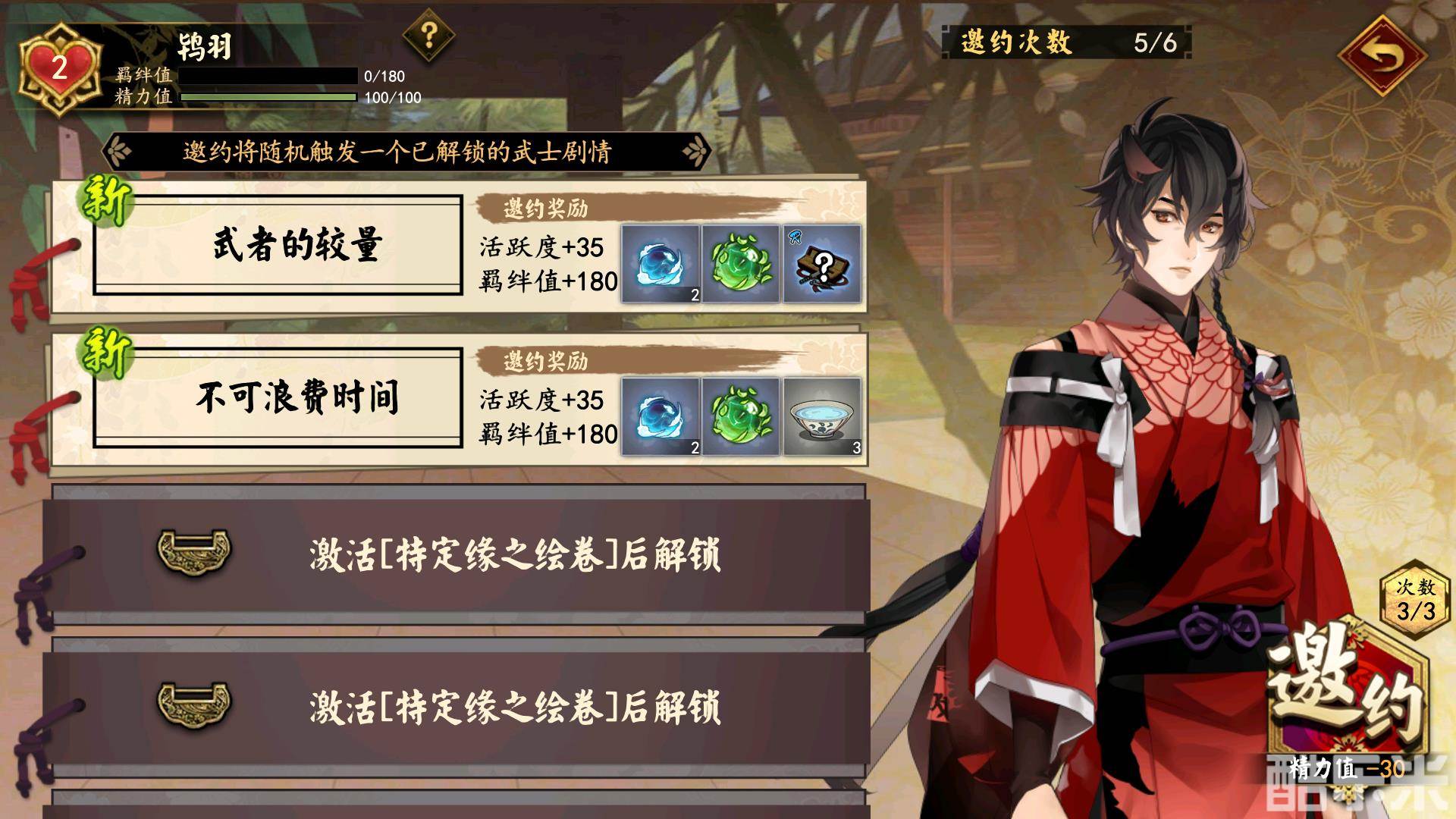 对了忘了说了,邀约进行的武士剧情是随机进行的, 在武士剧情的后面可以直接看到奖励。而跟武士的羁绊以及缘之卷月、越深入,或者是在反复得到同一个武士的时候,武士的剧情才会额外开启新的篇章。