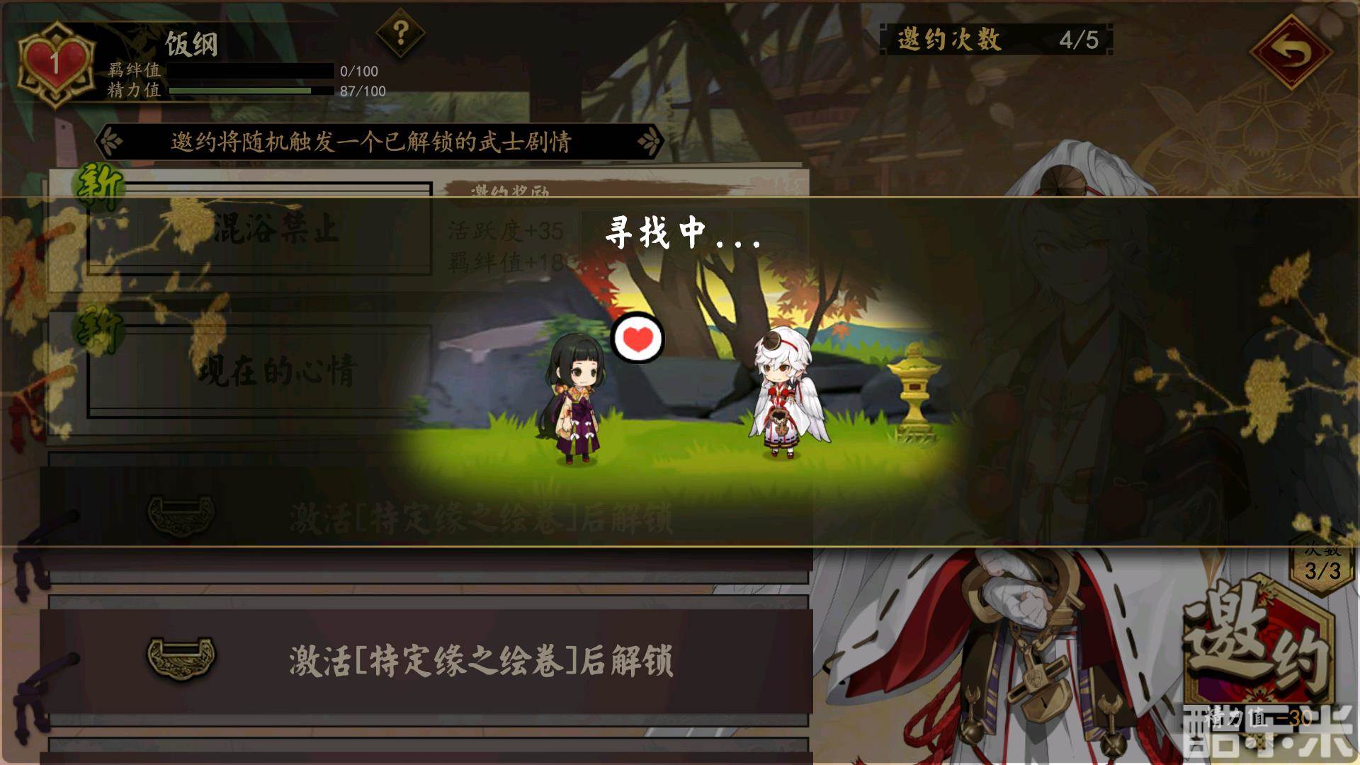 在邀约界面中,玩家们可以可以对自己想要提升羁绊值的武士发动“约会邀请”,每次需要消耗该武士的30点精力,精力要是不够,该玩法就无法发起。