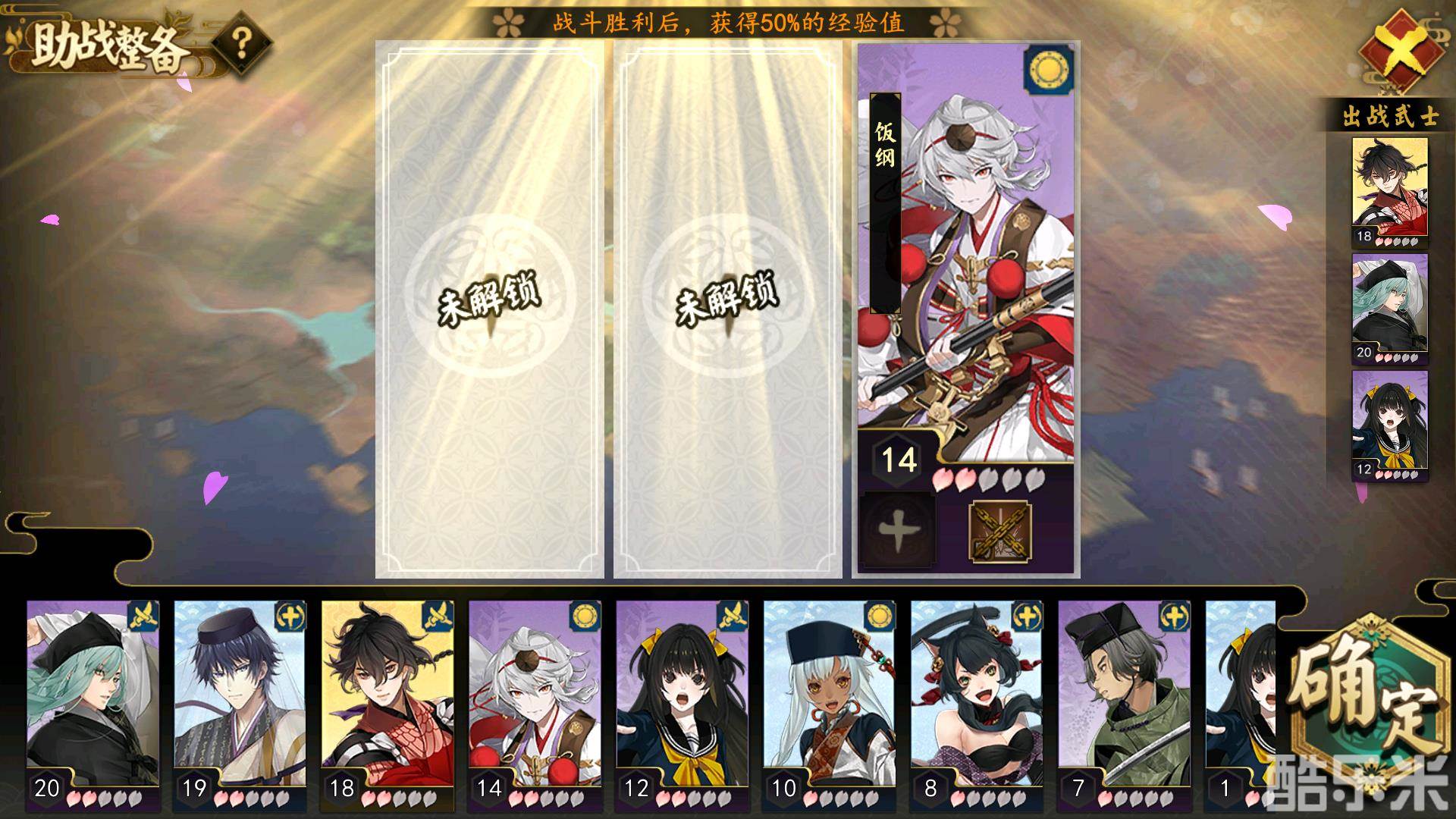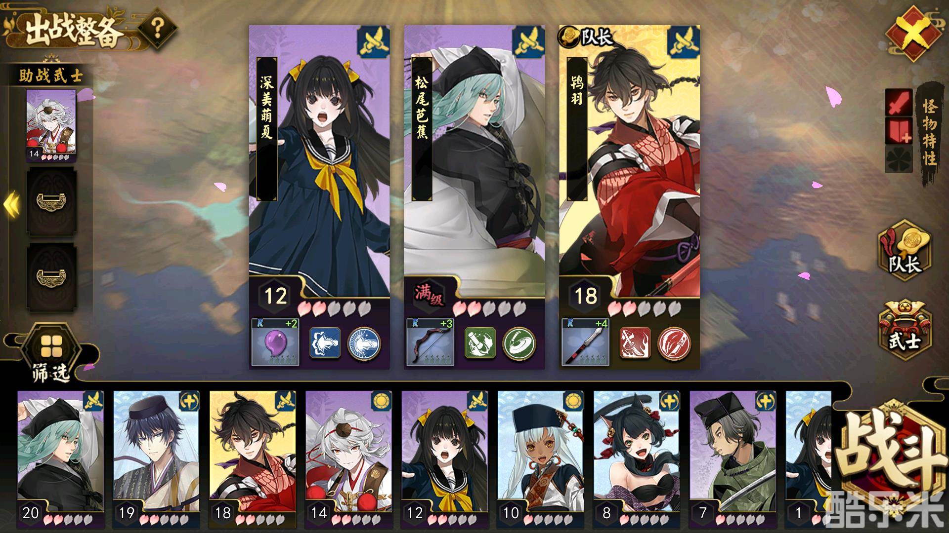 由于武士的队列一次只能出战三个,所以能够获得经验的也是这三个。但是在助战系统的帮助下,可以将未出战的武士放置到助战位置。在助战位置的武士根据其本身的实际情况来给主队伍的三位武士带来一定的属性加成,并且出战结束后能够获得该场战斗的百分之50的经验。