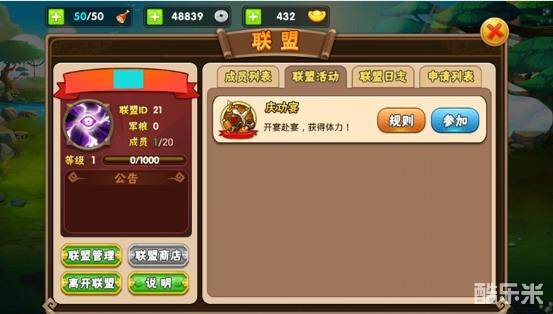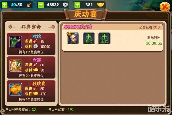 狂欢宴:举办者可立即获得50点体力,宴会有4个席位,需消耗120元宝。