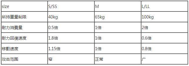 另外,所持物越重,不管体型的大小,都会影响移动速度,耐力的消耗,回复能力。