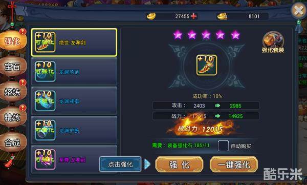 2、 玩家通过使用强化石,可以强化装备,装备强化等级越高,所加成的人物角色属性越高;